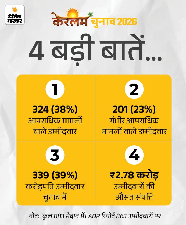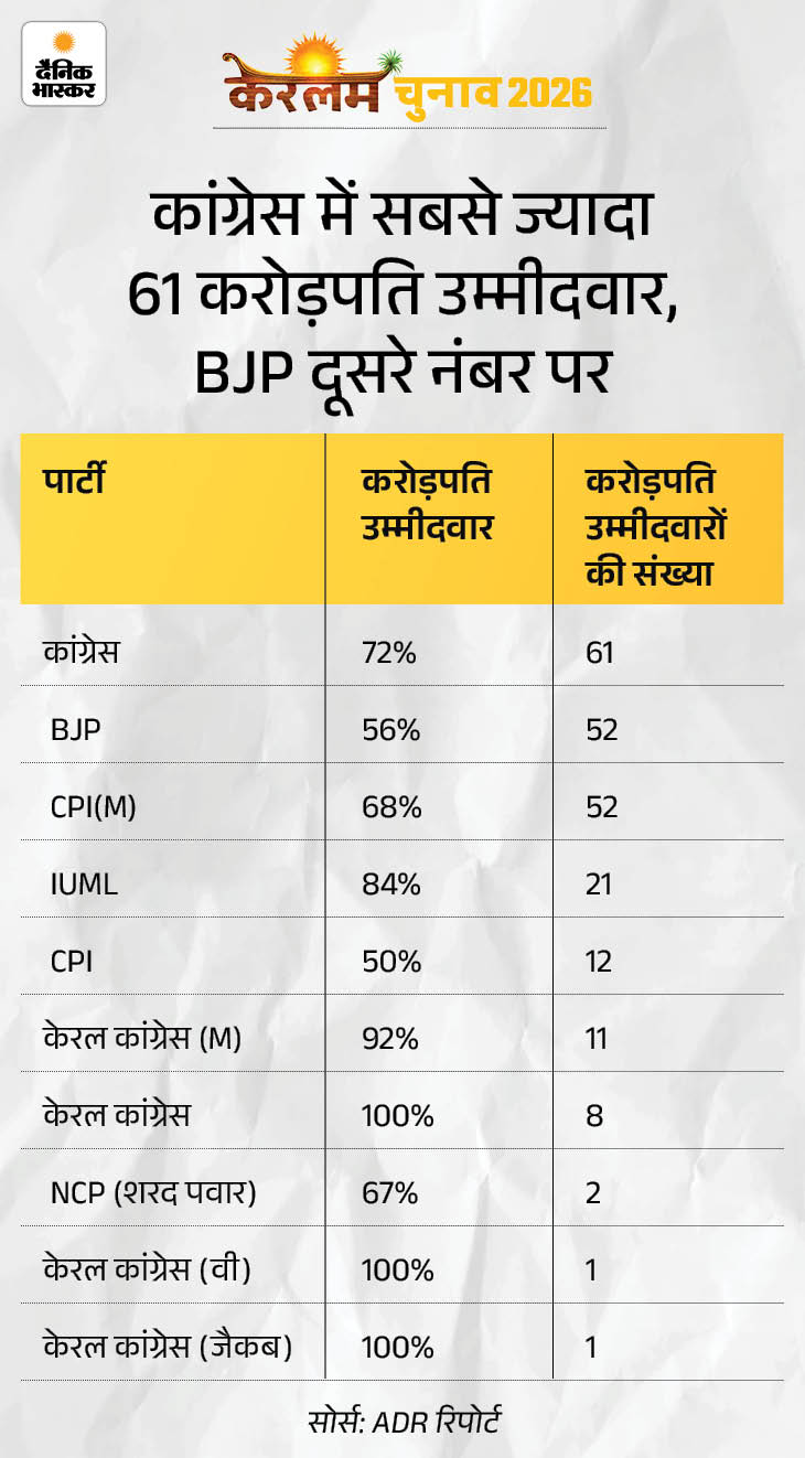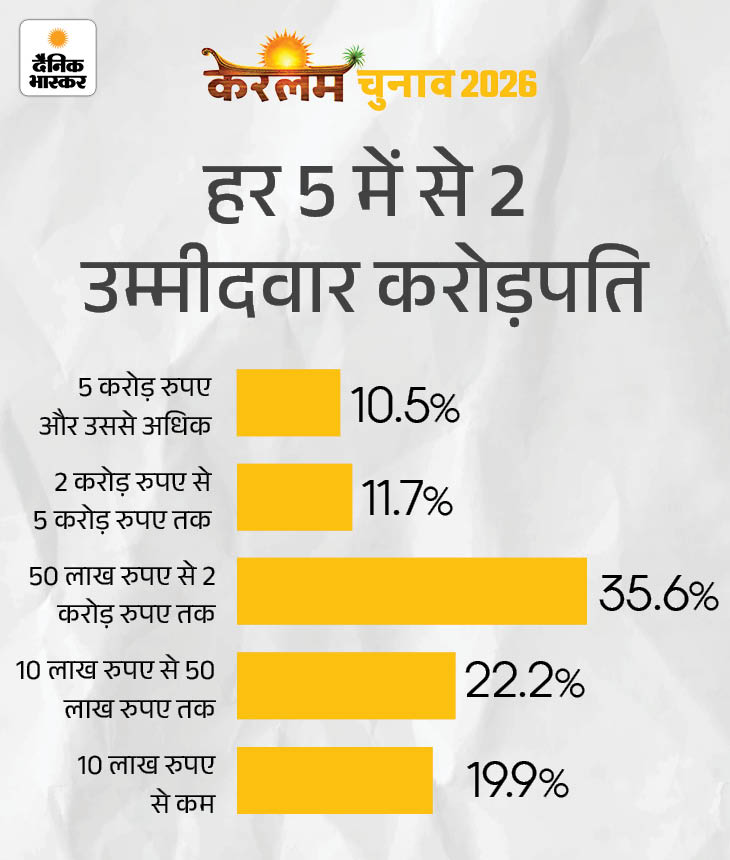 2021 के विधानसभा चुनाव में जहां 27% उम्मीदवार करोड़पति थे, वहीं 2026 में ये संख्या 39% हो गई। हर उम्मीदवार की औसत संपत्ति 2.78 करोड़ है। BJP के एक उम्मीदवार की एवरेज संपत्ति 5.7 करोड़, कांग्रेस की 3.93 करोड़ और CPI(M) की 2.3 करोड़ है।