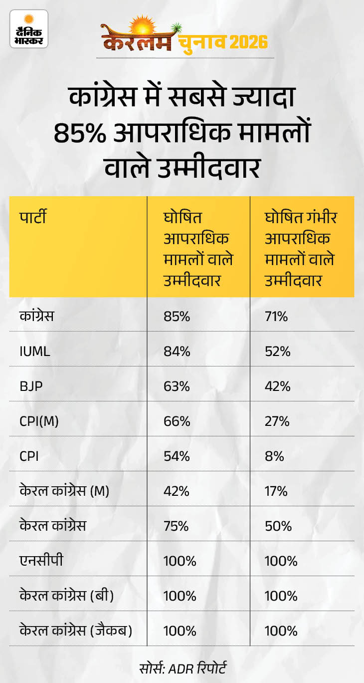 कांग्रेस भाजपा और CPI के 255 में से 182 उम्मीदवारों पर आपराधिक केस चल रहे हैं। 17 उम्मीदवारों पर हत्या से जुड़े आरोप हैं। वहीं, 15 पर महिला अपराध से जुड़े केस हैं। चुनाव लड़ रहे सभी दलों ने कम से कम 42% टिकट ऐसे कैंडिडेट्स को दिए हैं जिनपर आपराधिक मामले चल रहे हैं। 201 कैंडिडेट्स पर गंभीर आपराधिक मामले हैं।