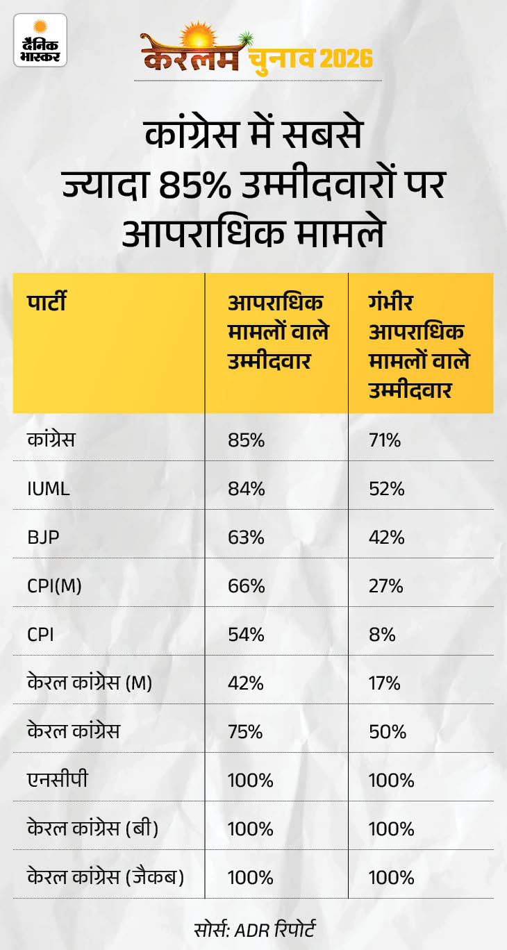केरलम विधानसभा चुनाव में 38% उम्मीदवारों पर क्रिमिनल केस दर्ज हैं। इनमें सबसे ज्यादा 72 उम्मीदवार कांग्रेस से हैं। BJP के 59 और CPI(M) के 51 उम्मीदवार हैं। वहीं, 23% पर हत्या और बलात्कार जैसे गंभीर केस दर्ज हैं।