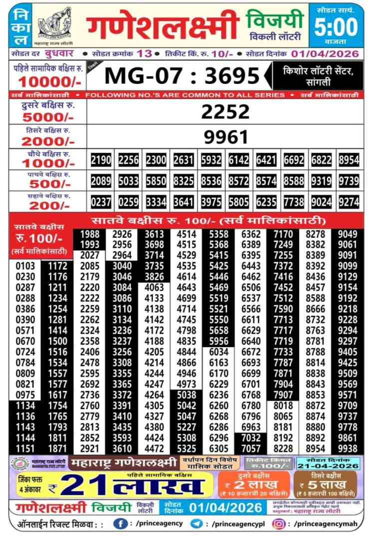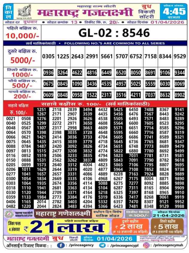 Maharashtra Gajlaxmi Budh Weekly Lottery Result