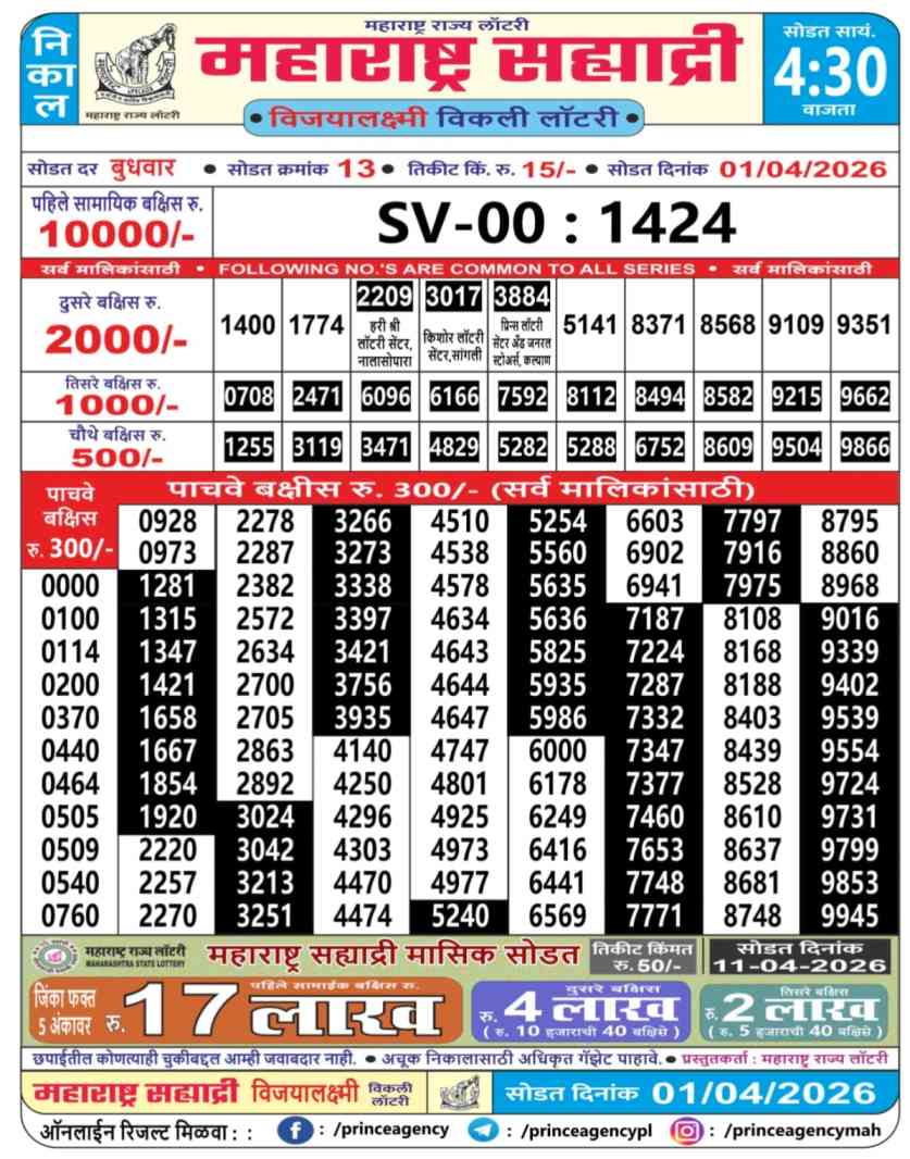 Maharashtra Sahyadri Mahalaxmi Weekly Lottery Result