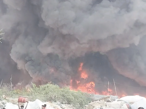 गाजियाबाद में गुरुवार दोपहर करीब 12 बजे 200 झुग्गी-झोपड़ियों में भीषण आग लग गई। सिलेंडरों में लगातार धमाके होते रहे। धुएं का गुबार करीब 10 किलोमीटर दूर तक दिखाई दिया। मौके पर अफरा-तफरी मच गई। लोग अपने घरों का सामान और गैस सिलेंडर लेकर भागते नजर आए। आसपास की इमारतों को एहतियातन खाली करा लिया गया। फायर ब्रिगेड की 22 गाड़ियों ने आग पर काबू पाया। प्रशासन ने नोएडा से भी दमकल की गाड़ियां मंगाईं। आग इंदिरापुरम थाना क्षेत्र के कनवानी गांव में लगी। घटना में फिलहाल किसी के हताहत होने की सूचना नहीं है। प्रत्यक्षदर्शी आशीष गुप्ता ने बताया- कुछ लोग झुग्गियों में खाना बना रहे थे, तभी तिरपाल में आग लग गई। देखते-देखते आग भड़क गई और पास में स्थित पन्नी का गोदाम जलकर राख हो गया। डीएम रविंद्र कुमार ने बताया कि इलाके में कबाड़ का काम होता था। यही काम करने वाले लोग झुग्गियां बनाकर रहते हैं। किसी भी तरह की अनहोनी से निपटने के लिए एंबुलेंस मौके पर मौजूद हैं। पास के अस्पतालों को भी अलर्ट मोड पर रखा गया है। इससे पहले, बुधवार को लखनऊ के विकासनगर में झुग्गी-झोपड़ियों में आग लगी थी। इसमें 250 झोपड़ियां जलकर राख हो गई थीं। 2 सगी बहनों की मौत भी हुई थी। आग की 5 तस्वीरें… गाजियाबाद में आग की घटना से जुड़े पल-पल की अपडेट के लिए नीचे लाइव ब्लॉग से गुजर जाइए…