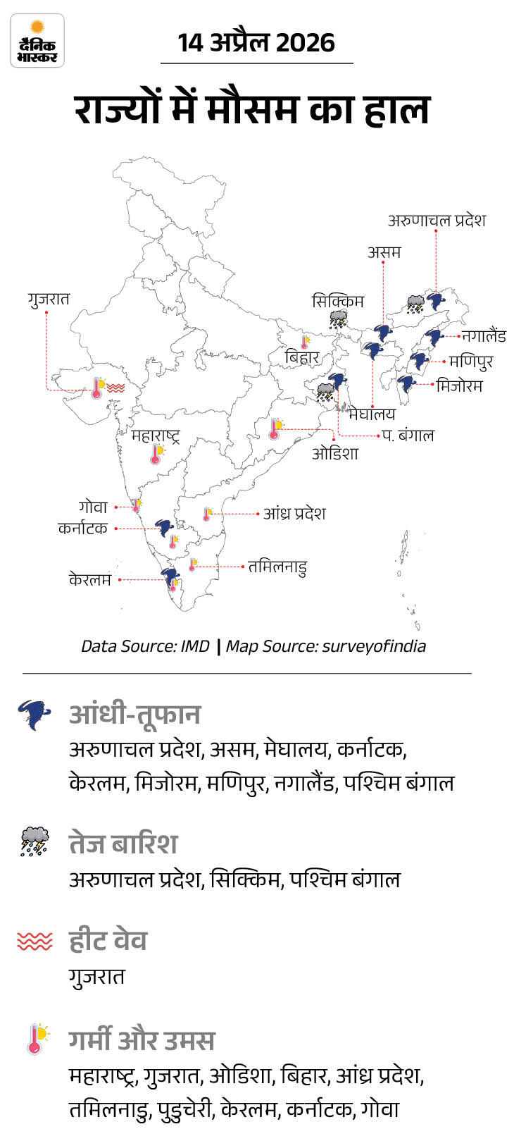 - 15 अप्रैल: उत्तर प्रदेश, मध्य प्रदेश, राजस्थान, हरियाणा, पंजाब और उत्तराखंड में गर्मी बढ़ेगी। मध्य प्रदेश में तापमान 3-5°C तक बढ़ सकता है। पूर्वोत्तर राज्यों में बारिश, गरज-चमक और तेज हवाएं चल सकती हैं। पश्चिम बंगाल में भी हल्की बारिश की संभावना है।