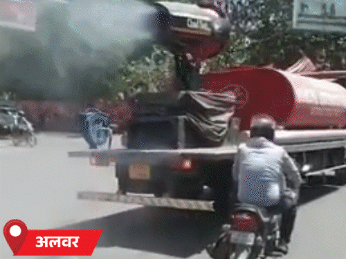आगरा में किले के पास गर्मी से राहत दिलाने के लिए नगर निगम का टैंकर पानी का छिड़काव कर रहा है। इस बीच एक व्यक्ति फुहारों से खुद को भिगोता दिखाई दिया।