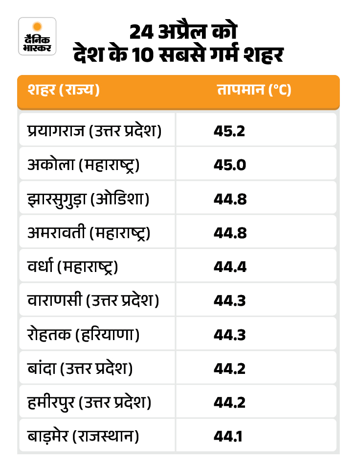 इससे पहले शुक्रवार को देश का सबसे गर्म शहर उत्तर प्रदेश का प्रयागराज रहा। यहां तापमान 45.2°C दर्ज किया गया। वहीं महाराष्ट्र के अकोला में पारा 45°C, अमरावती में 44.8°C रहा।