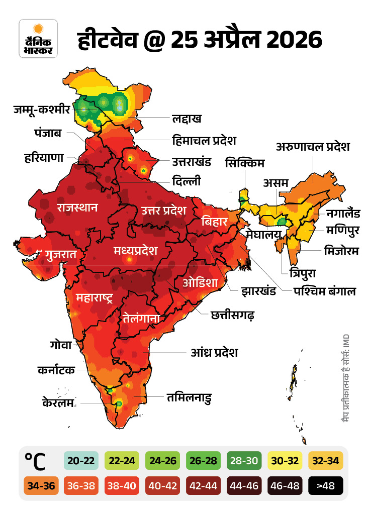 उत्तर प्रदेश के 60 जिलों में लू का रेड अलर्ट है। ओडिशा के झारसुगुड़ा में लगातार दूसरे दिन तापमान 44.8°C रहा। मध्य प्रदेश के 11 जिलों में लू का अलर्ट है। हिमाचल प्रदेश के 3 जिलों में हीटवेव चल रही है।