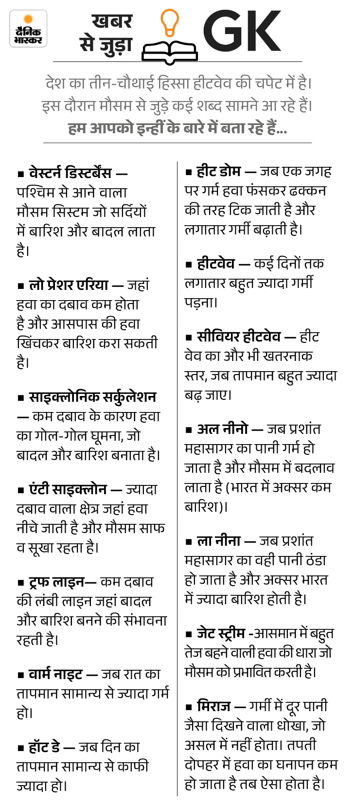 • बिहार, छत्तीसगढ़, हरियाणा, चंडीगढ़, दिल्ली, मध्य प्रदेश, पंजाब, महाराष्ट्र, राजस्थान और उत्तर प्रदेश में हीटवेव चलेगी। हरियाणा, चंडीगढ़, दिल्ली, ओडिशा और उत्तर प्रदेश के कुछ इलाकों में गर्म रातें रहने की भी आशंका है।