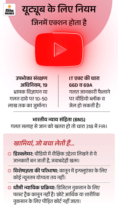 यदि इन चैनलों पर बताई गई किसी सलाह से किसी को नुकसान हो जाए तो न्याय पाने का रास्ता इतना पेचीदा है कि अपराधी साफ बच निकलता है। देश में हर 10 में से 7 लोग यूट्यूब की सलाह पर भरोसा करते हैं, जिनमें से 60% उसे बिना क्रॉस-चेक किए सही मान लेते हैं।