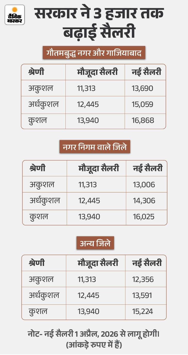 • इसके अलावा, अन्य नगर निगम क्षेत्रों में अकुशल श्रमिकों की मजदूरी 11,313 से बढ़ाकर 13,006 की गई है। अर्धकुशल श्रमिकों की मजदूरी 12,445 से बढ़ाकर 14,306 की गई है। ऐसे ही कुशल श्रमिकों की मजदूरी 13,940 से बढ़ाकर 16,025 कर दी गई है।