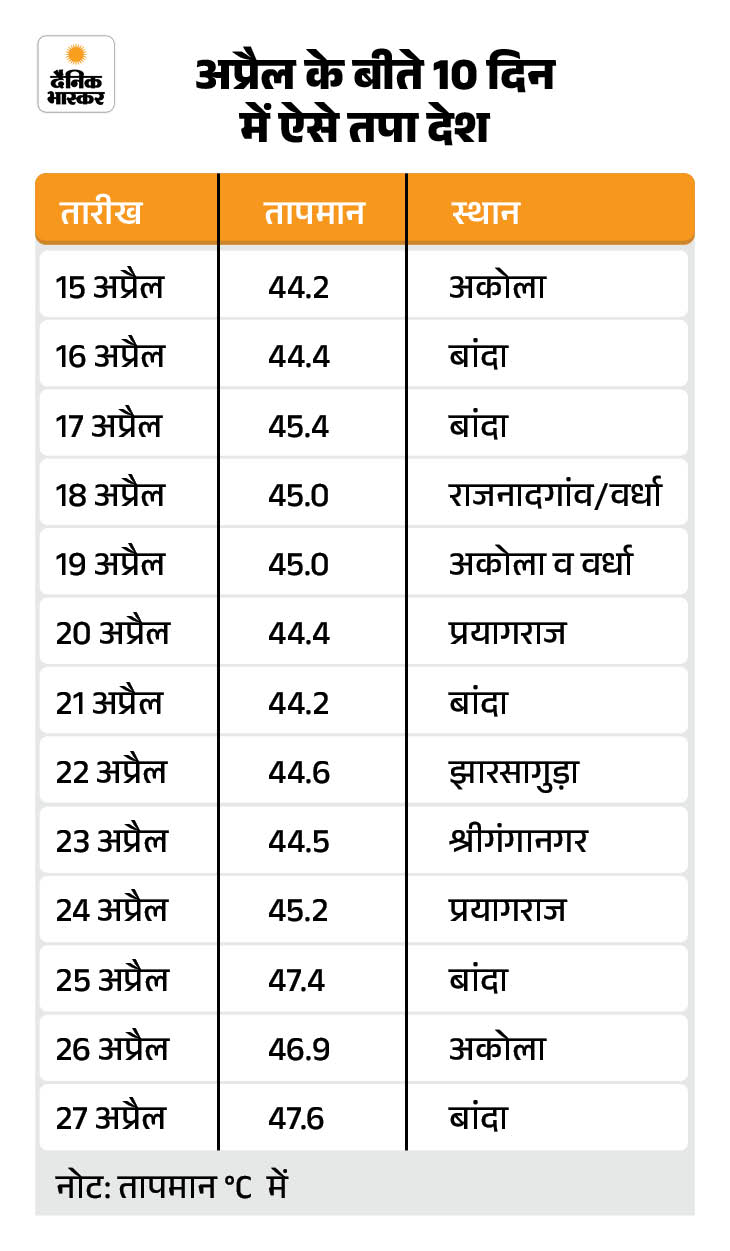 बांदा का 47.6°C तापमान अप्रैल महीने के इतिहास में दर्ज देश का सबसे ज्यादा तापमान है। इस साल अप्रैल में अब तक करीब 45 बार देश के अलग-अलग स्टेशनों पर तापमान 45°C से ऊपर दर्ज हुआ है। यह 2022 के बाद सबसे ज्यादा है। उस साल 56 बार ऐसा हुआ था। मतलब ये कि इस बार अप्रैल का महीना पिछले 4 साल में सबसे गर्म रहा है।