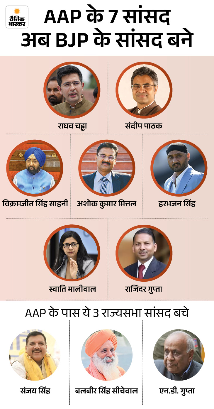 इसी बीच राज्यसभा ने AAP के 7 सांसदों और BJP के मर्जर को मंजूरी दे दी है। अब राघव चड्‌ढा, अशोक मित्तल, विक्रमजीत साहनी, हरभजन सिंह भज्जी, डॉ. संदीप पाठक, स्वाति मालीवाल और राजिंदर गुप्ता को ऑफिशियल तौर पर BJP के सांसद बन गए हैं। अब राज्यसभा में भाजपा के 113 सांसद हो गए हैं।