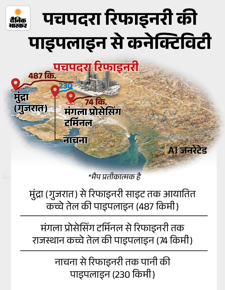 आप देखिए कि पाकिस्तान से लगते आधे बॉर्डर पर हमारी आर्म फोर्सेज को तो यहीं से सप्लाई हो जाएगी। मौजूदा स्थिति में भारत लगभग 40 से अधिक देशों से कच्चा तेल आयात करता है और 100 से ज्यादा देशों को रिफाइंड पेट्रोलियम उत्पादों का निर्यात करता है। यह भारत को एक ‘रिफाइनिंग सुपर पावर’ के रूप में स्थापित करता है। पचपदरा रिफाइनरी इस क्षमता को और मजबूत करेगी। इससे न केवल देश की ऊर्जा सुरक्षा बेहतर होगी, बल्कि रणनीतिक दृष्टि से भी भारत की स्थिति मजबूत होगी। खासकर हमारी आर्म्ड फोर्सेज के लिए सप्लाई ज्यादा सुरक्षित, तेज और कम लागत वाली हो जाएगी।