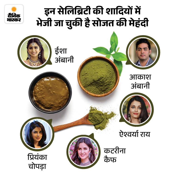 क्यों खास है सोजत की मेहंदी? सोजत की मेहंदी को इसकी शुद्धता और गहरे रंग के लिए GI टैग (Geographical Indication) भी मिल चुका है। यहां की मेहंदी में किसी भी प्रकार के हानिकारक केमिकल के बजाय प्राकृतिक तेलों का उपयोग किया जाता है, जो इसे अंतरराष्ट्रीय मानकों पर खरा उतारता है।