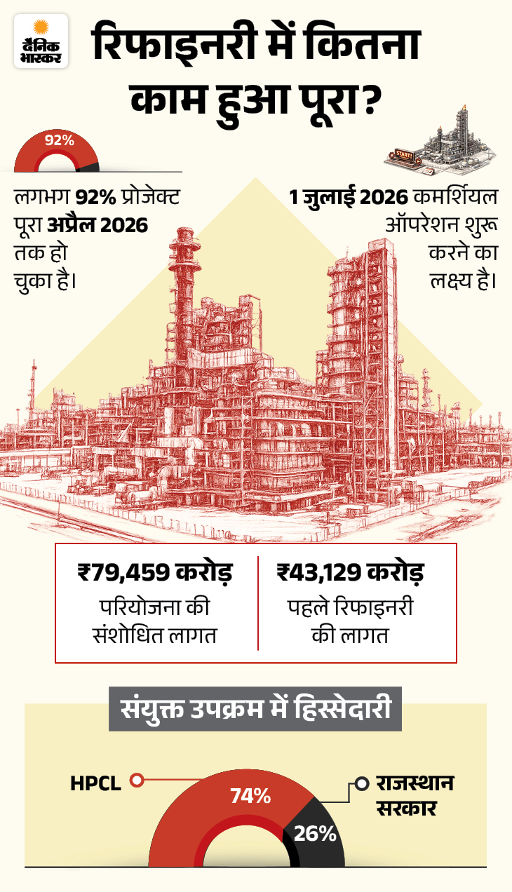 पचपदरा रिफाइनरी में HPCL की 74% और राजस्थान सरकार की 26% हिस्सेदारी है। इस रिफाइनरी का काम अप्रैल 2026 में पूरा करने का लक्ष्य है, जबकि पूरी तरह पेट्रोलियम उत्पादन का टारगेट जुलाई 2026 रखा गया है।
