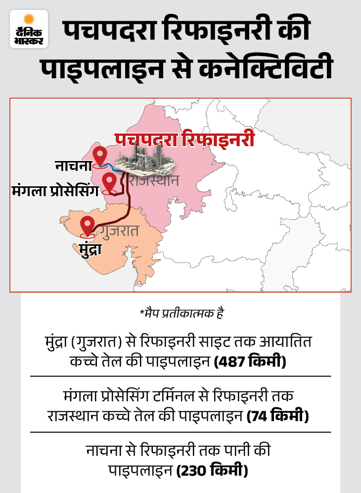 राजस्थान की इस रिफाइनरी में गुजरात के मुंद्रा पोर्ट से पाइप लाइन के जरिए कच्चा तेल लाया जाएगा। मुंद्रा से इसकी दूरी करीब 487 किलोमीटर है।