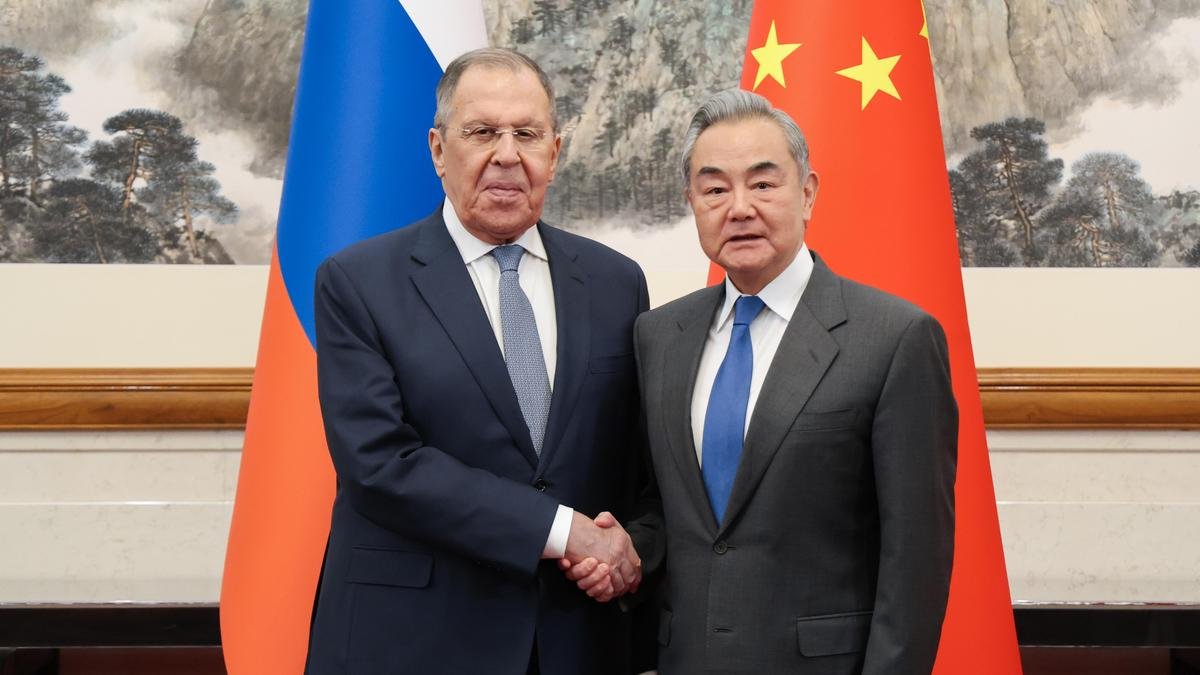 In this photo, provided by the Russian Foreign Ministry Press Service, Russian Foreign Minister Sergey Lavrov and Chinese Foreign Minister Wang pose for a photo before the talks in Beijing, China, on April 14, 2026.
