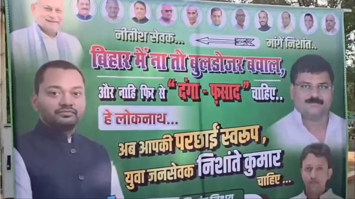 One of the posters carried a message in Hindi stating, “We do not need a bulldozer, nor riots-unrest in Bihar. We need loknayak. It is time for him to come out of the shadow. We need youth leader Nishant Kumar.”