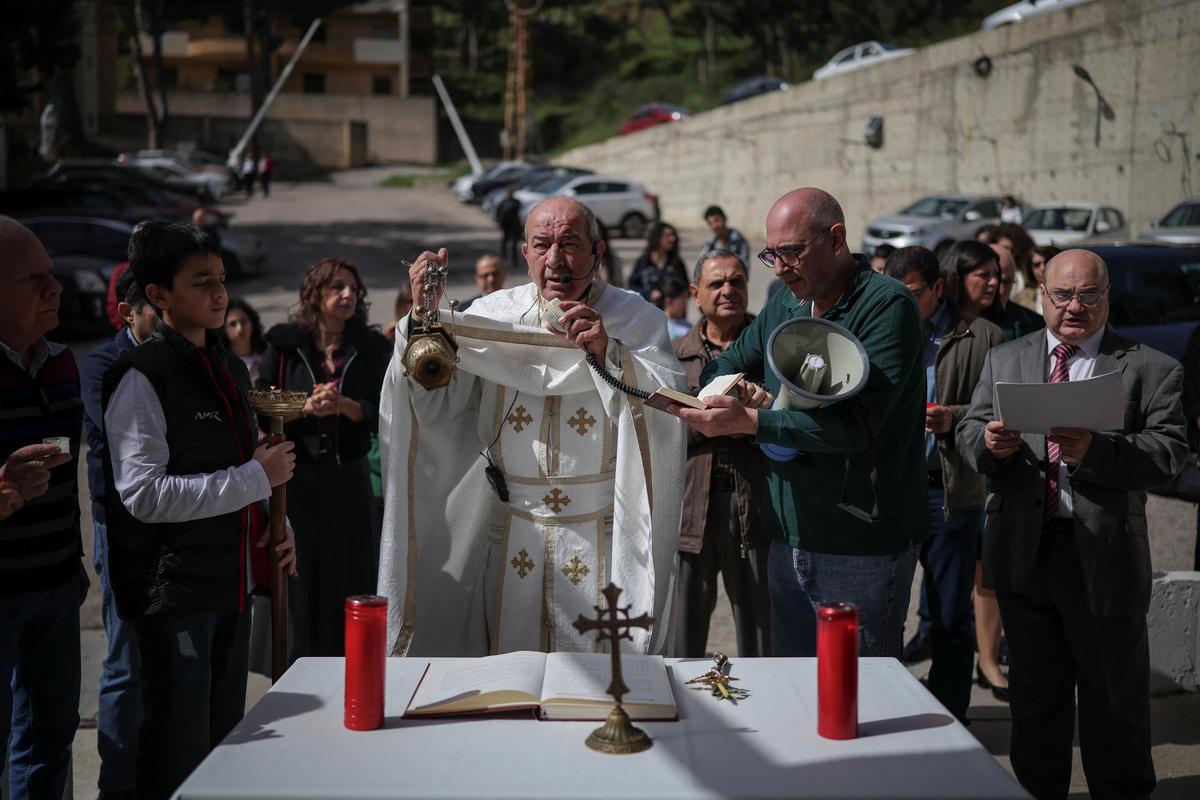 Seen here, Father Pierre Lahoud leads an Easter Mass at the “Our Lady of Hope” church, attended also by displaced faithful from southern Lebanon, amid escalating hostilities between Israel and Hezbollah, as the U.S.-Israel conflict with Iran continues, in Beirut, Lebanon, on April 5, 2026.