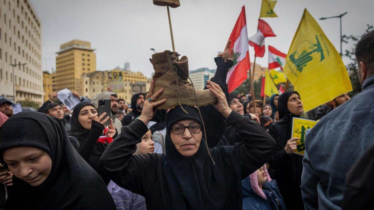 Demonstrators, including Hezbollah supporters, attend a protest against the direct negotiation between Israel and the Lebanese government, in Beirut, Lebanon, April 10, 2026.