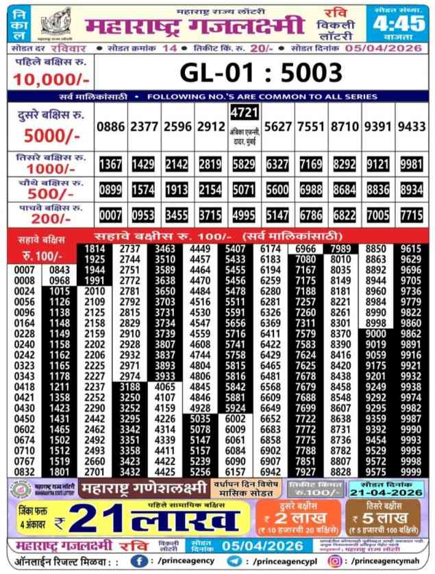 Maharashtra Gajlaxmi Ravi Weekly Lottery Result
