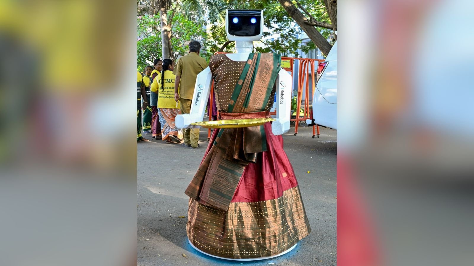 Tina, a robot, dressed in traditional attire, welcomes voters during polling in the Tamil Nadu Assembly elections, at a polling station in Coimbatore, Thursday, April 23, 2026. (PTI Photo)
