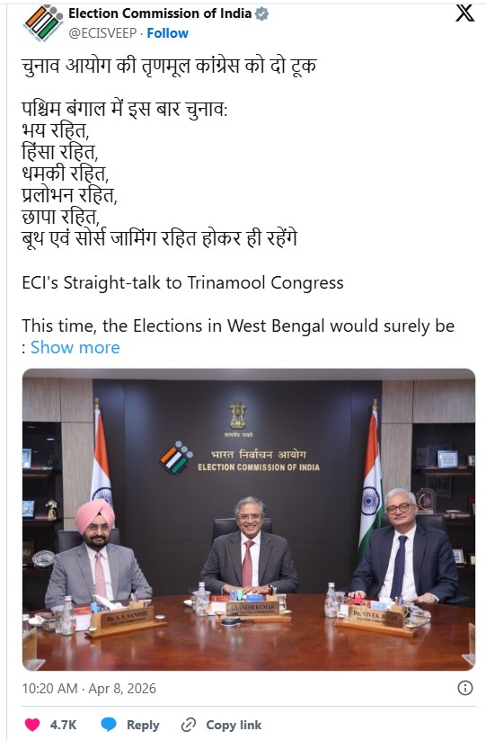 टीएमसी के साथ बैठक खत्म होने के बाद चुनाव आयोग ने सुबह 10:20 बजे सोशल मीडिया X पर एक पोस्ट किया। उसने लिखा- चुनाव आयोग की टीएमसी को दो टूक। बंगाल में इस बार चुनाव भय रहित और हिंसा रहित होंगे।