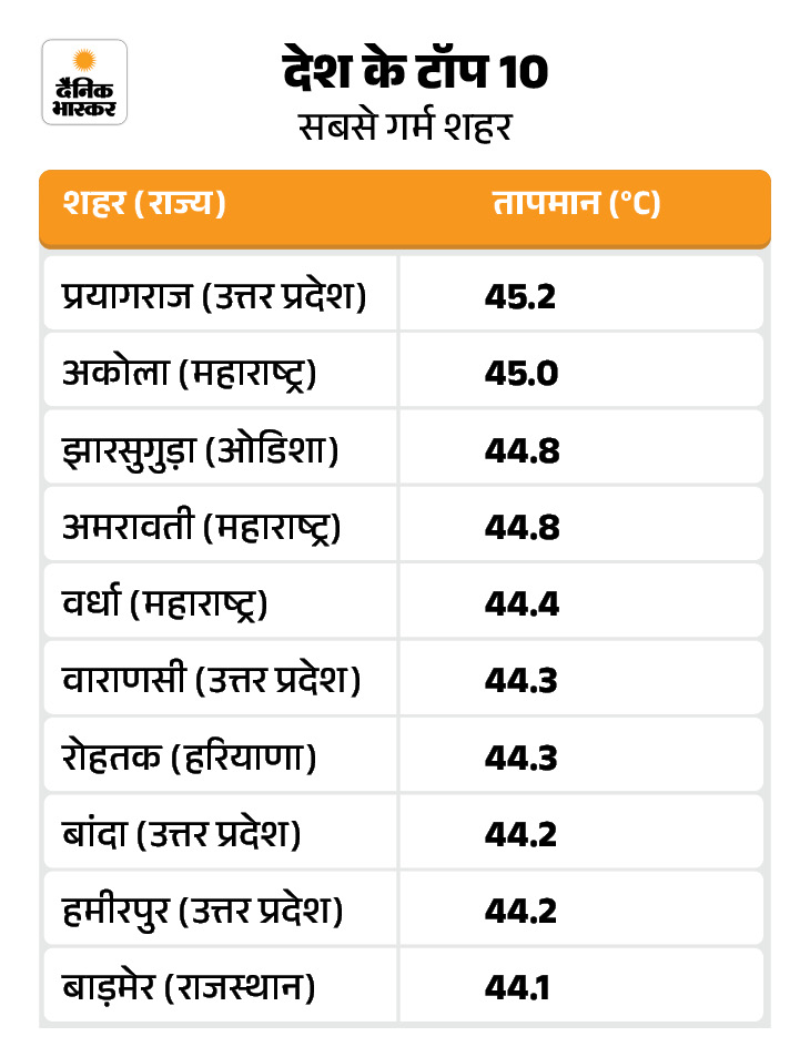 देश के कई हिस्सों में लू का असर तेज होता जा रहा है। देश में शुक्रवार को उत्तर प्रदेश के प्रयागराज में सबसे ज्यादा तापमान 45.2°C दर्ज किया गया। वहीं महाराष्ट्र के अकोला में पारा 45°C, अमरावती में 44.8°C रहा। राजस्थान समेत 5 राज्यों के 14 शहरों में पारा 44°C के पार जा चुका है।