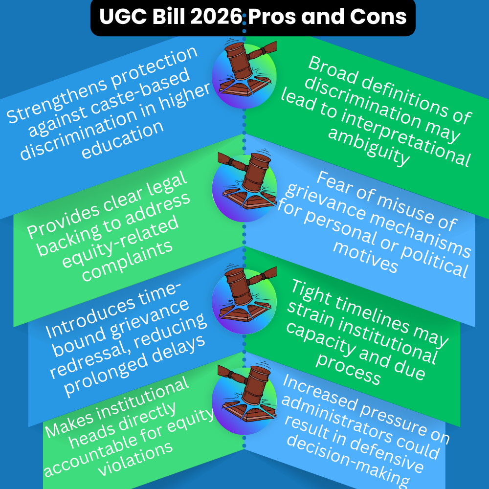 | Pros of UGC Bill 2026 | Cons of UGC Bill 2026 |